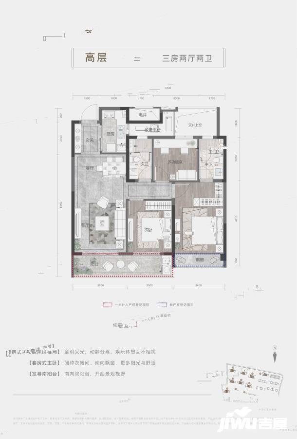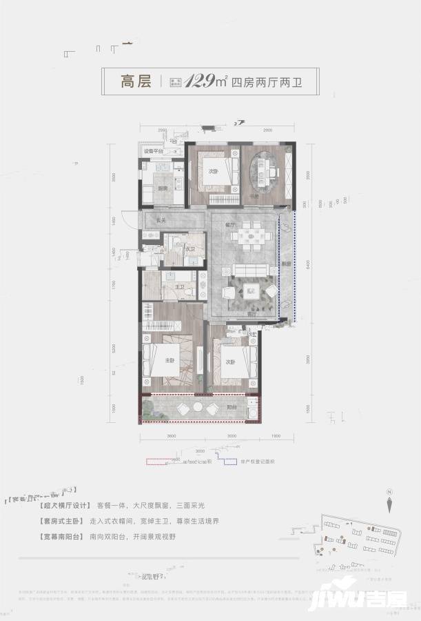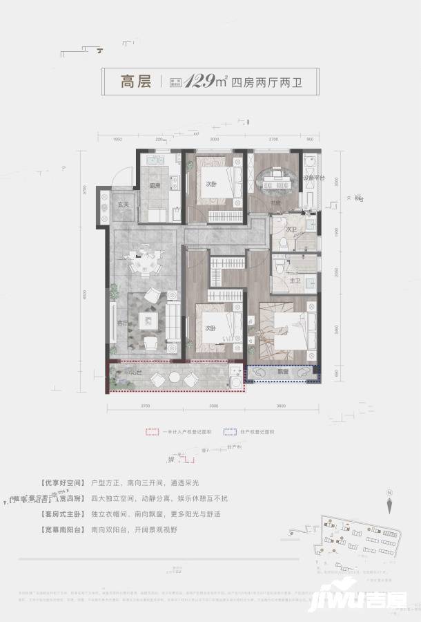- 129 平方米 4 室 2 廳 2 衛戶型:兩臥一廳南向三開間設計,獨立入戶玄關,主臥自帶主衛、衣帽間套房設計,注重私密性。除三開間朝南保證采光外,客廳、次臥南向大面寬連通陽臺,方便日常晾曬。同時,整個戶型動靜分區明顯,動區的廚、餐、客不會打擾到靜區的主臥休息和書房辦公學習。
