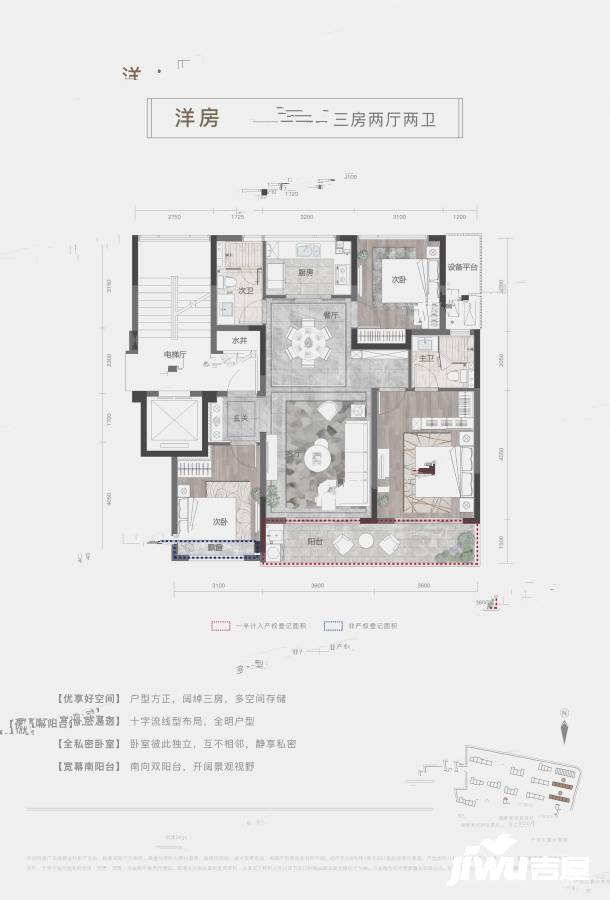 - 115 平方米 3 室 2 廳 2 衛戶型:該戶型為 1 梯 2 戶,有獨立入戶玄關,但入戶門正對臥室門,在一定程度上影響了私密性。采用 10.6 米南向三開間設計,客廳面寬 3.9 米,餐廳面寬 3.2 米,臥室開間都在 3.1 米以上,空間較為闊綽。三開間朝南超大面寬,保證了整個戶型的采光,且客廳、主臥大面寬連通陽臺,滿足了日常晾曬、儲納的需要。此外,該戶型動靜分區明確,客廳、餐廳位于戶型中央,靠近窗戶,采光良好,臥室區域相對獨立,私密性好。